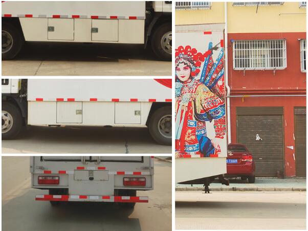 | 整车说明 | 该车是进行舞台文艺表演的专用车辆;专用装置:厢体,折叠式舞台.随底盘选装驾驶室.选装新结构导流罩.侧防护为裙板结构,后防护装置材料材质为Q235B碳钢,焊接连接,后防护断面尺寸(宽×高):45×100(mm),离地高度为415mm.ABS防抱死制动系统生产厂家/型号:1.广州瑞立科密汽车电子股份有限公司/CM4XL-4S/4M;2.浙江万安科技股份有限公司/VIE ABS-II.选装正后部图片.该车型仅选用排量小于等于2500ml的发动机。 | ||